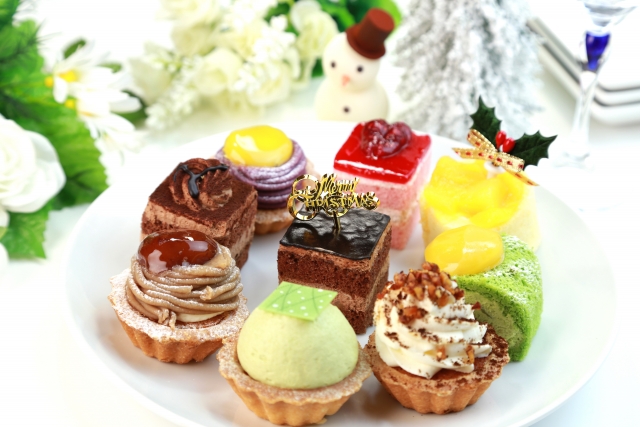 クリスマス向けデザインのホールケーキまたはカットケーキアソート
